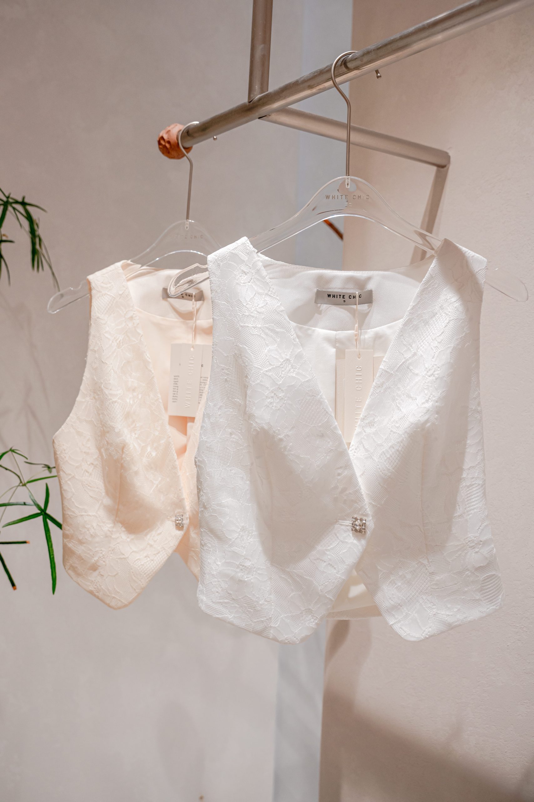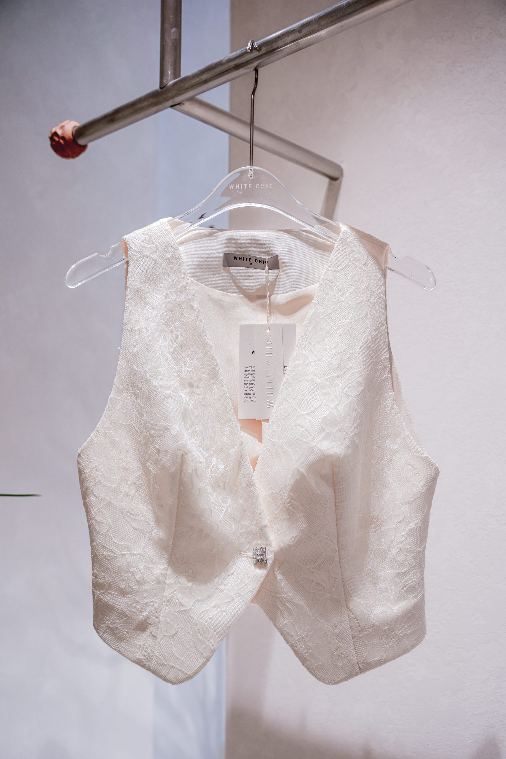 Điểm nhấn ren hoa mỏng manh hòa quyện cùng cấu trúc cổ V tạo nên hiệu ứng bề mặt giàu chiều sâu, gợi mở nét phóng khoáng đầy cuốn hút. Từng đường cắt bổ cong lấy cảm hứng từ hoa lục bình không chỉ định hình vóc dáng mà còn mang đến sự uyển chuyển, xóa nhòa ranh giới giữa sự cứng cáp và nét thơ ngây.