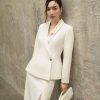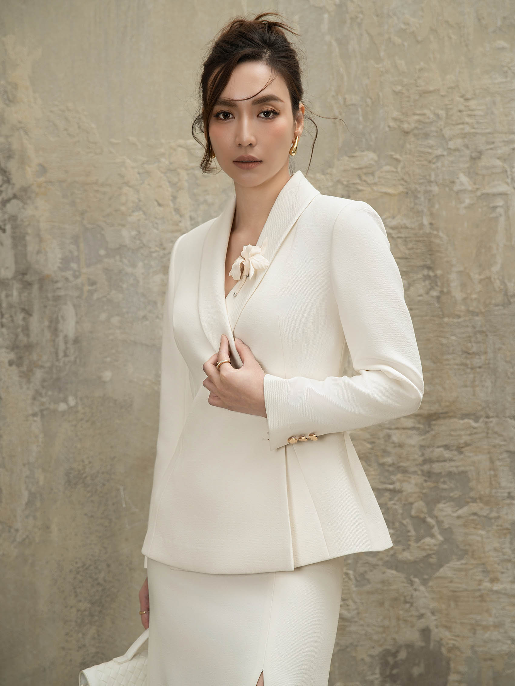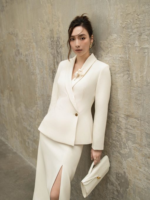 Chi tiết: Áo dáng ôm eo, tay dài, đánh phồng hông, dây trang trí cổ tay, cổ bẻ, vạt cài lệch