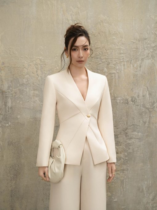 Chi tiết: Áo khoác dáng ôm, tay dài, cổ dựng, xếp ly