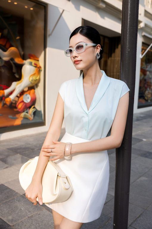1. Chi tiết: Áo sơ mi dáng suông, cổ V, tay hến.