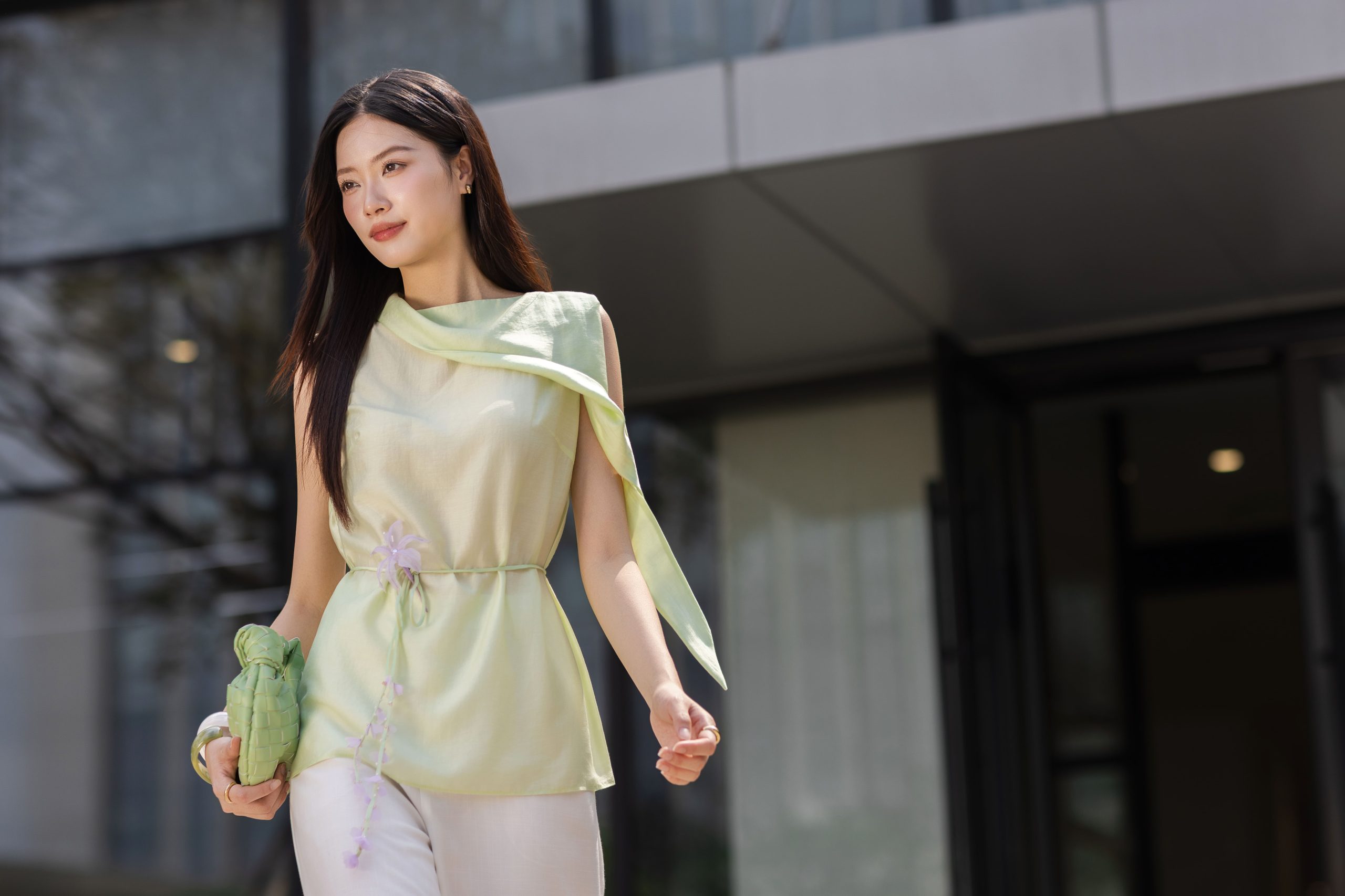 5. Mô tả: Thiết kế gây ấn tượng bởi dải dây cổ mềm mại tạo hiệu ứng chuyển động uyển chuyển, kết hợp cùng dây buộc hoa thắt nhẹ vùng eo để định hình vóc dáng thanh thoát. Chất liệu tơ Tencel tự nhiên không chỉ mang lại sự thoáng mát mà còn như một làn gió nhẹ nâng niu cảm xúc, giúp duy trì trạng thái thư thái và tự tin dù ở công sở hay khi dạo phố.