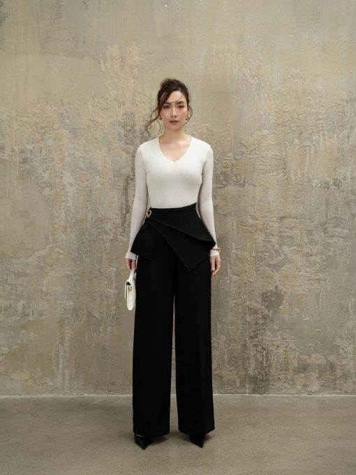 Chi tiết: Quần ống suông, cạp liền, vạt xếp tầng