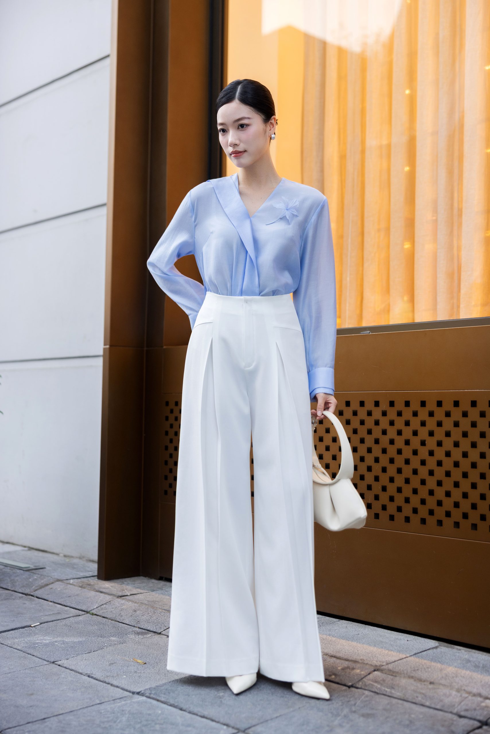 5. Mô tả: Những đường xếp ly tỉ mỉ tạo độ rủ và chuyển động nhịp nhàng, mang lại hiệu ứng thị giác về một đôi chân dài thanh mảnh. Khả năng giữ form ưu việt của chất liệu Poly công nghệ cao là lời cam kết cho một vẻ ngoài chỉn chu, giúp duy trì phong thái hiện đại và thanh lịch suốt cả ngày dài (sản phẩm chưa bao gồm hoa cài).