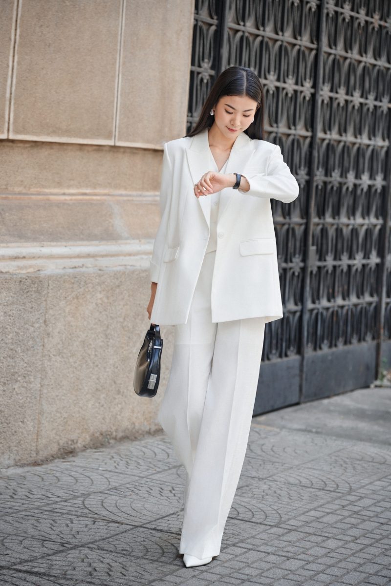 - Phong cách tối giản: Kết hợp suit đơn sắc cùng áo lụa hoặc sơ mi trắng, thêm một đôi giày cao gót mũi nhọn, bạn đã có ngay vẻ ngoài chuyên nghiệp và sang trọng.