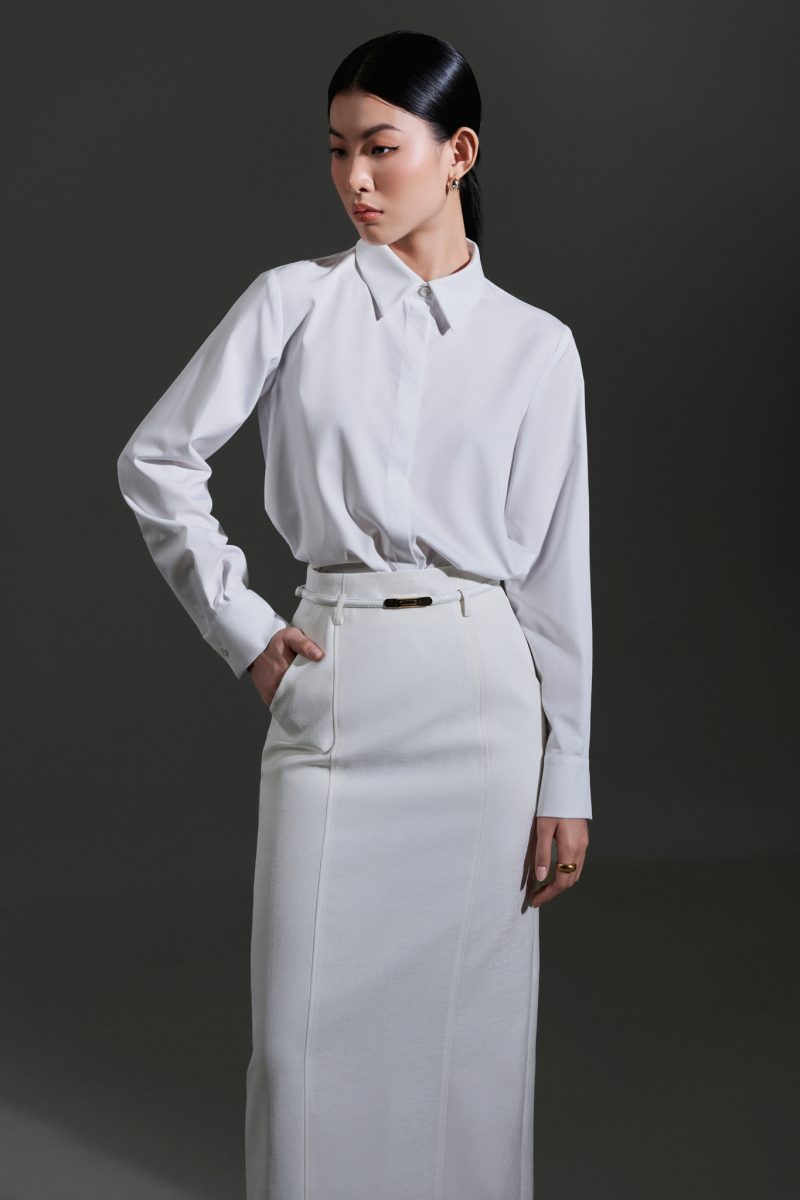 Là lựa chọn linh hoạt nhất, có thể diện khi đi làm, dự họp, hoặc kết hợp linh hoạt với vest và chân váy để tạo nhiều phong cách khác nhau. Một chiếc sơ mi trắng hay lụa pastel luôn là “must-have” trong tủ đồ của mọi quý cô công sở.